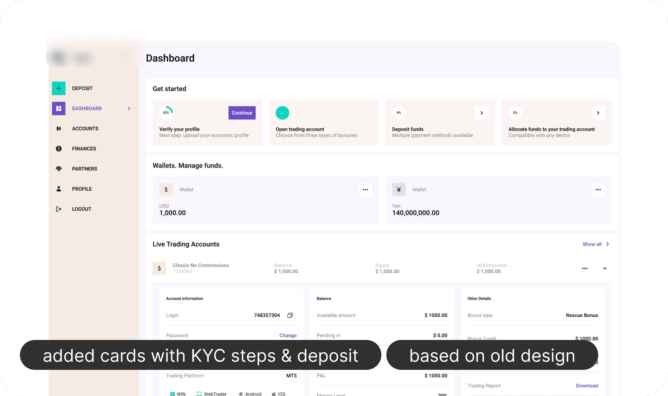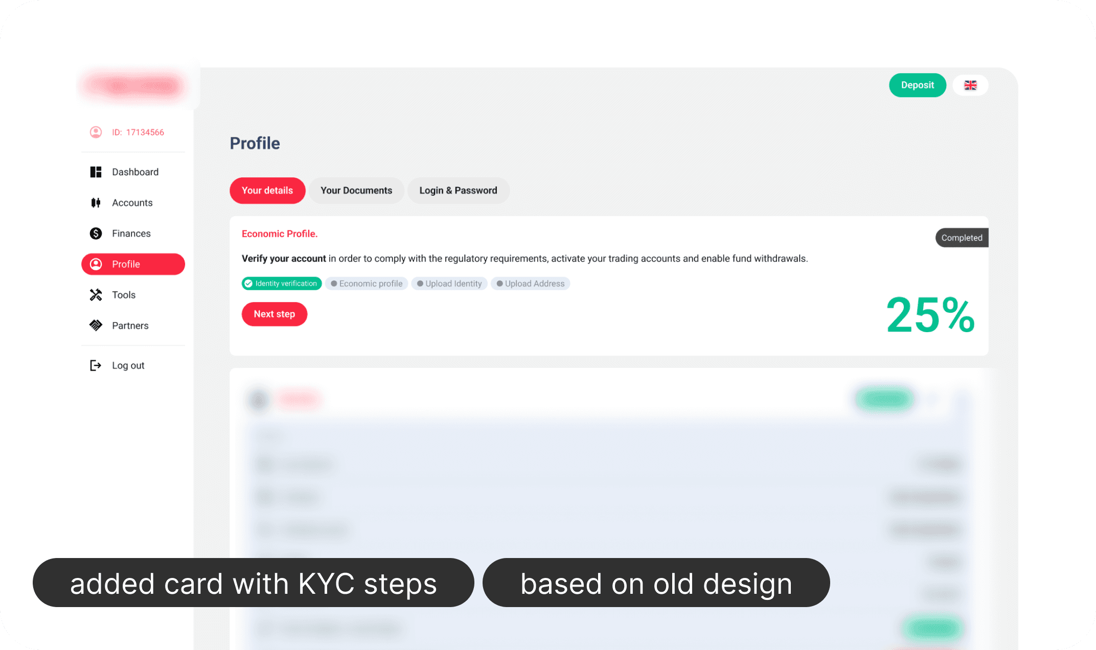 Users who registered but didn’t complete KYC were invisible in the old flow. Adding a persistent KYC progress card on the dashboard brought these users back into the activation funnel. Cards were designed in collaboration with marketing requirements — motivational, stage-by-stage, with clear next action always visible.