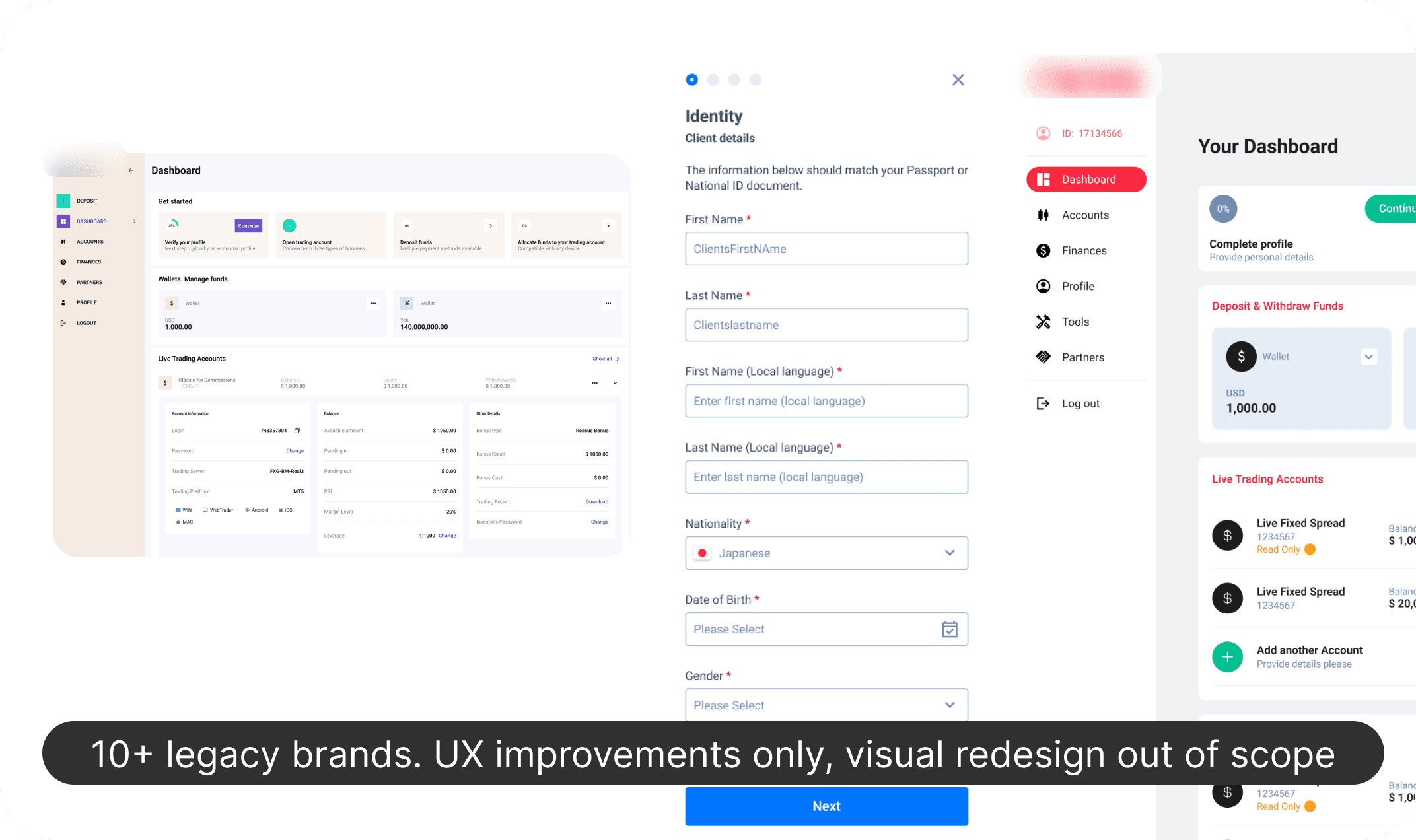 A complete redesign of KYC and registration flows across 10+ broker brands — driven by data, constrained by regulation, measured by conversion.