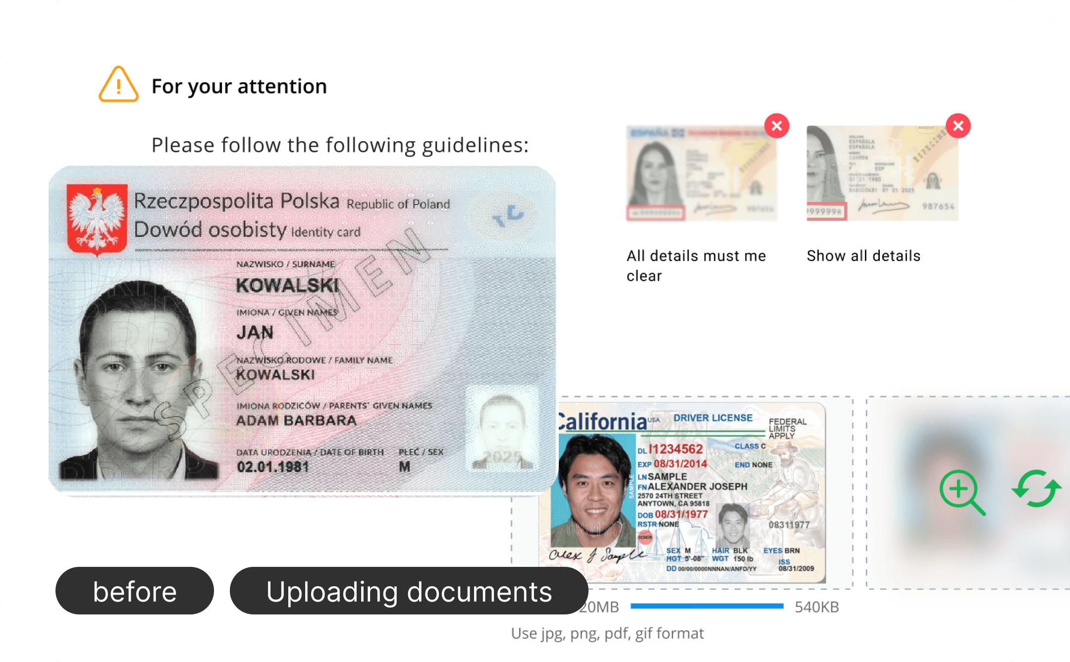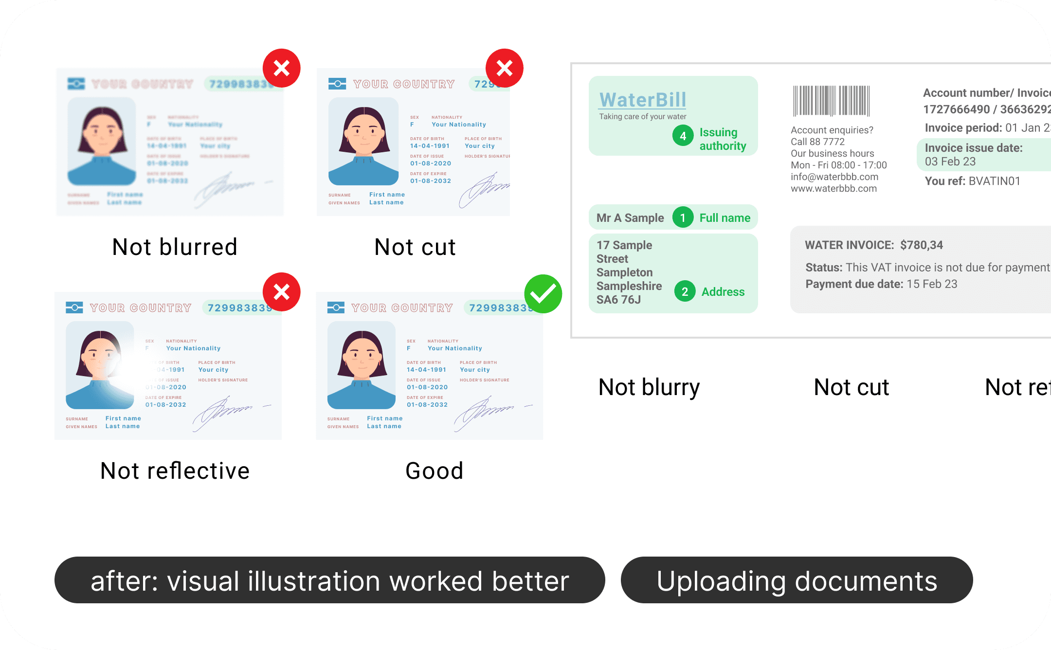 Visual document examples (Gosuslugi approach) dramatically reduce wrong submissions — showing angle, lighting, no blur