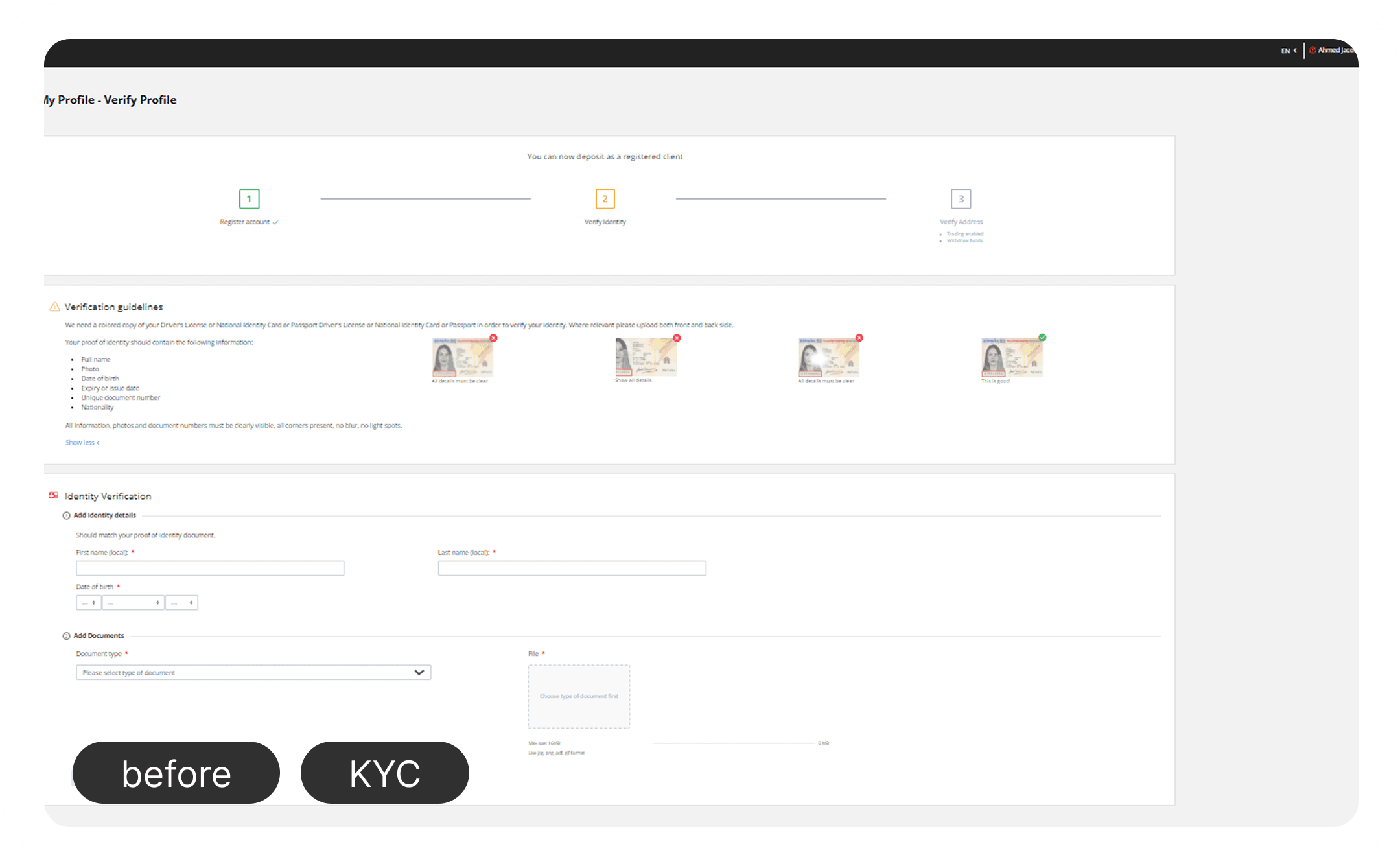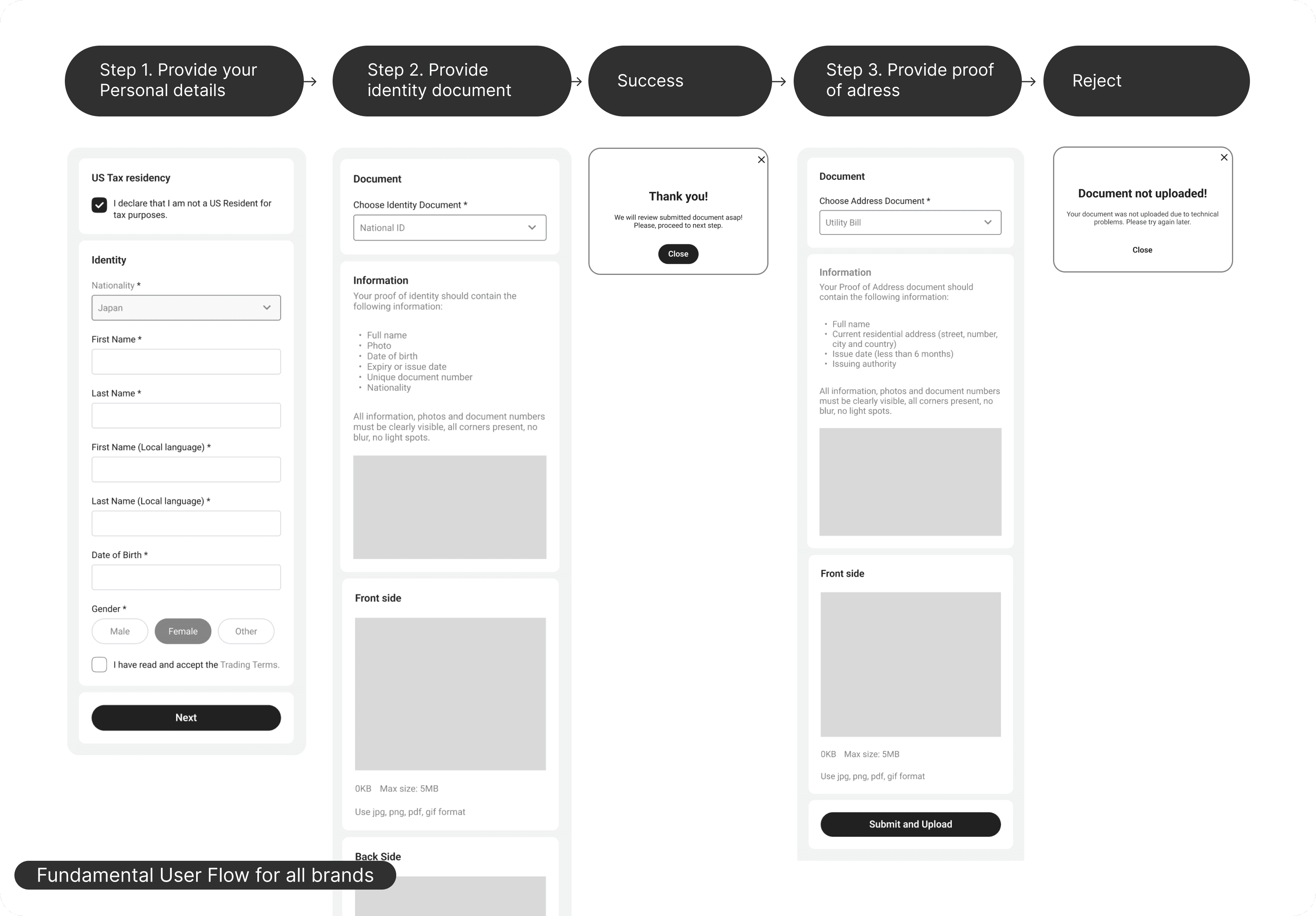 The core KYC logic is consistent across brands. Implementation varies per brand depending on design constraints and regulatory requirements.