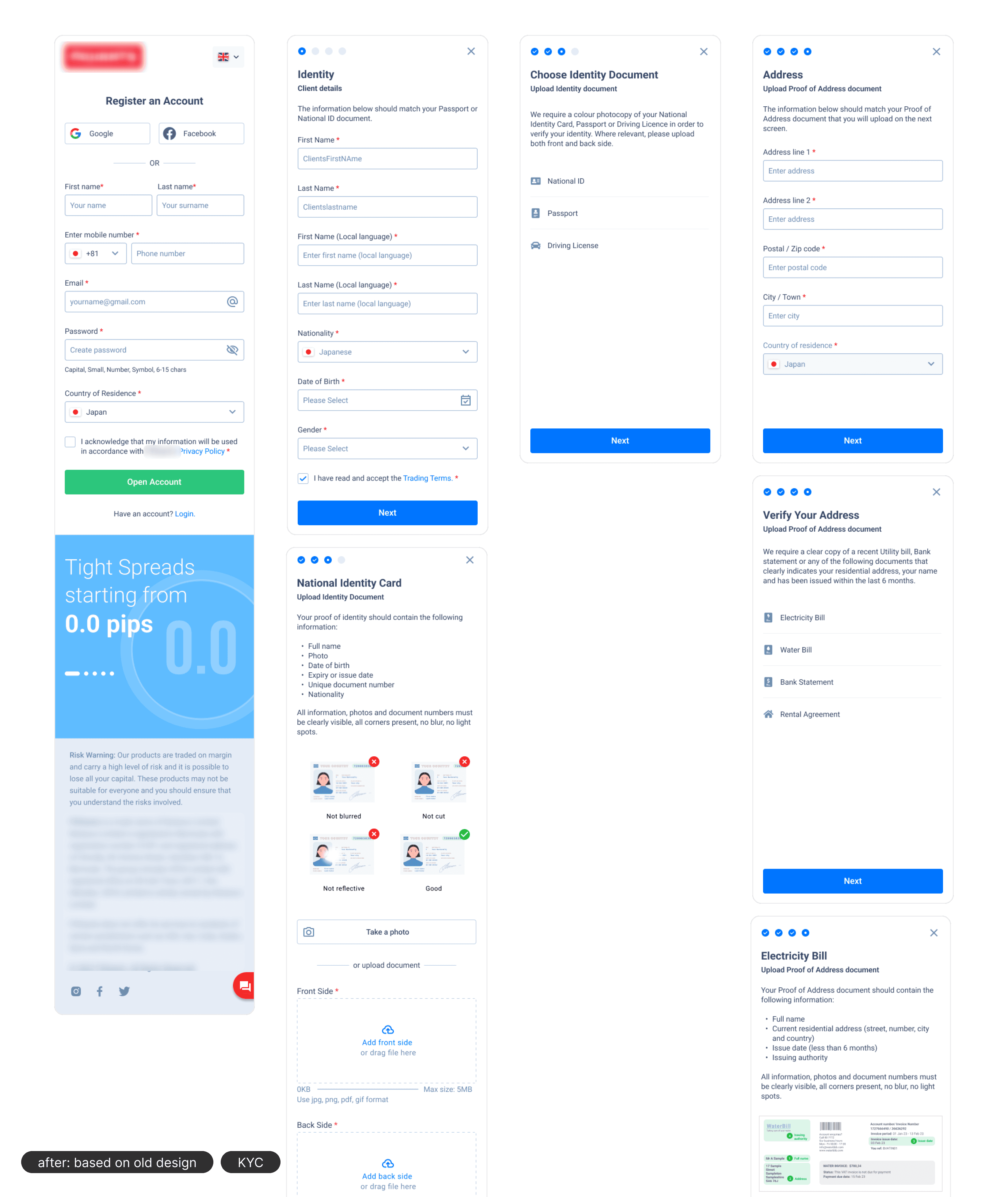 End-to-end redesign across registration, KYC flow, statuses, and document upload. Adapted for 10+ brands.