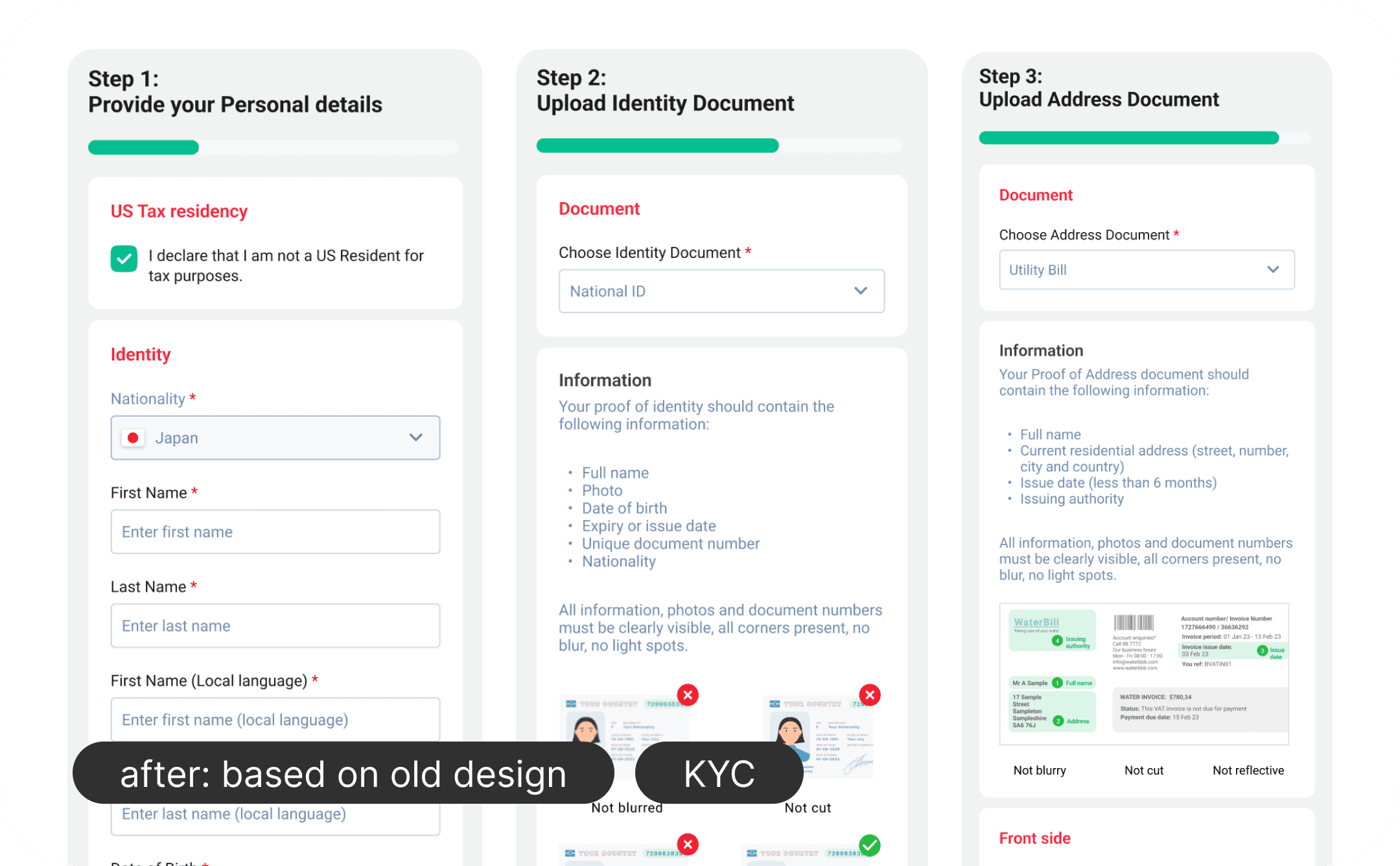 Regulatory: KYC steps cannot be removed — required by financial regulators across multiple countries. Every field and document request exists for compliance reasons.