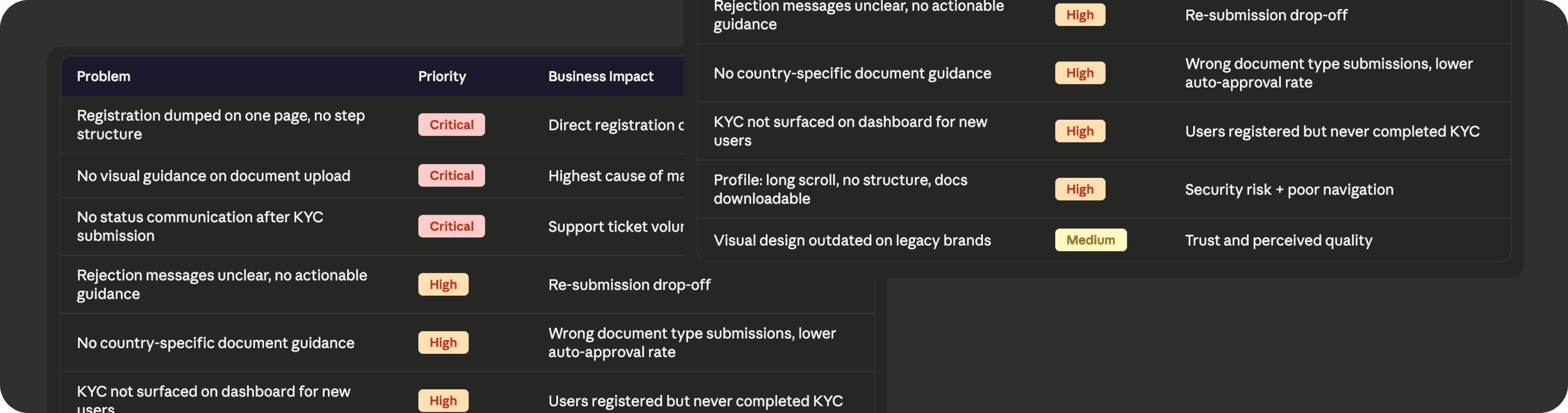 Mapped all friction points: unclear statuses, doc visibility issues, registration flow, KYC steps. Prioritised by business impact.