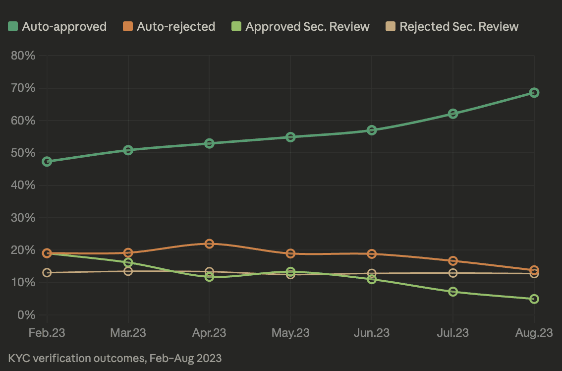Auto-approved users grew from 47% to 68% within 3 months — more users reaching trading without manual review delays.