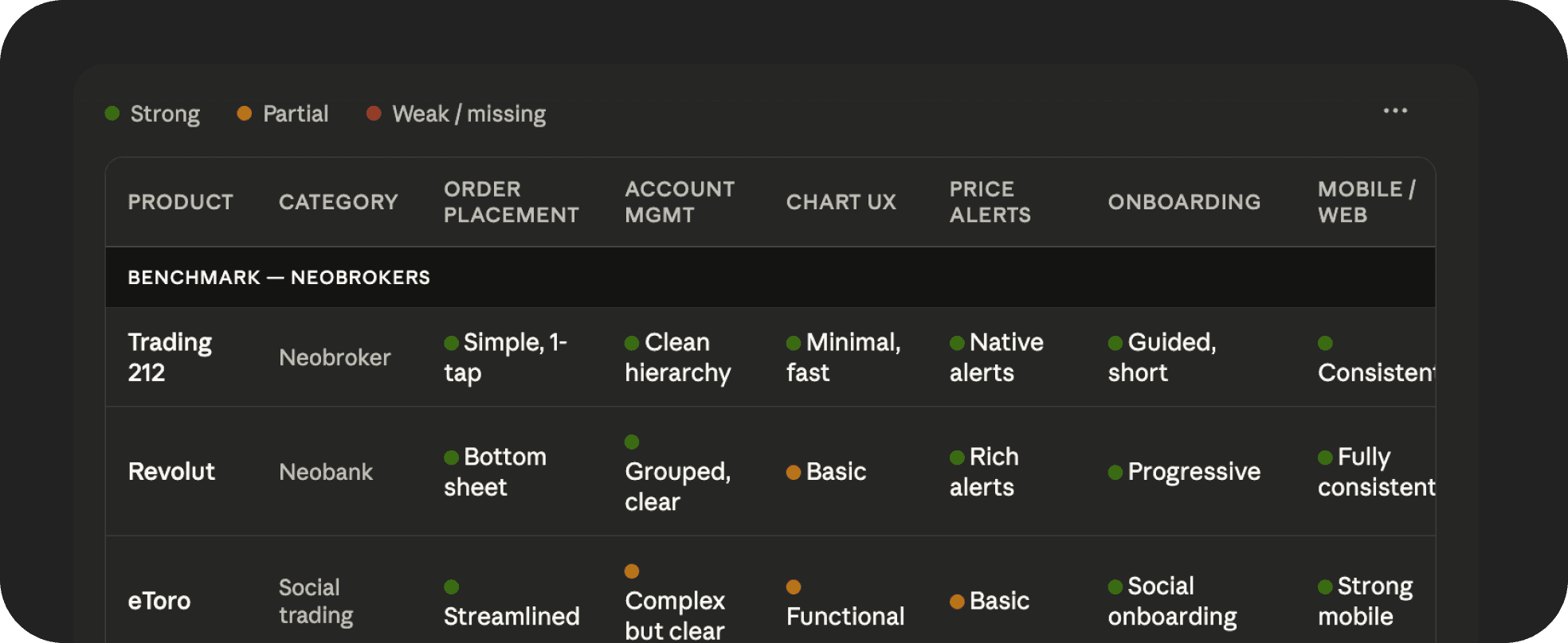 Feature Comparison Matrix — products as columns, criteria as rows, green/yellow/red ratings. Criteria: order placement simplicity, account management, chart UX, price alerts, onboarding, mobile/web consistency.