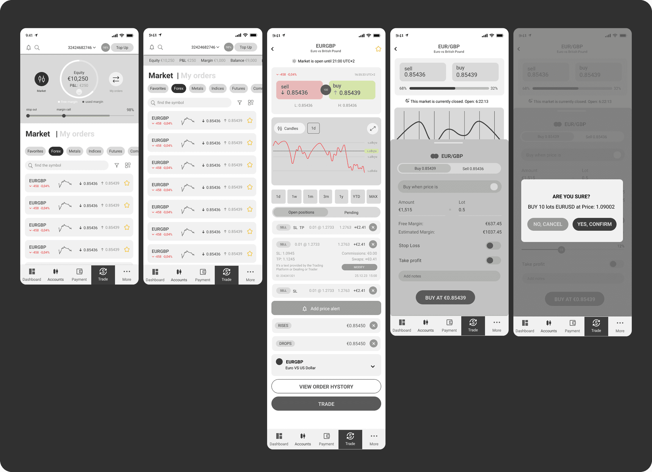 Wireframes focused on logic, not visuals: how account data surfaces in the top bar, how the order sheet overlays the chart without losing context, how portfolio cards present complex financial data simply.