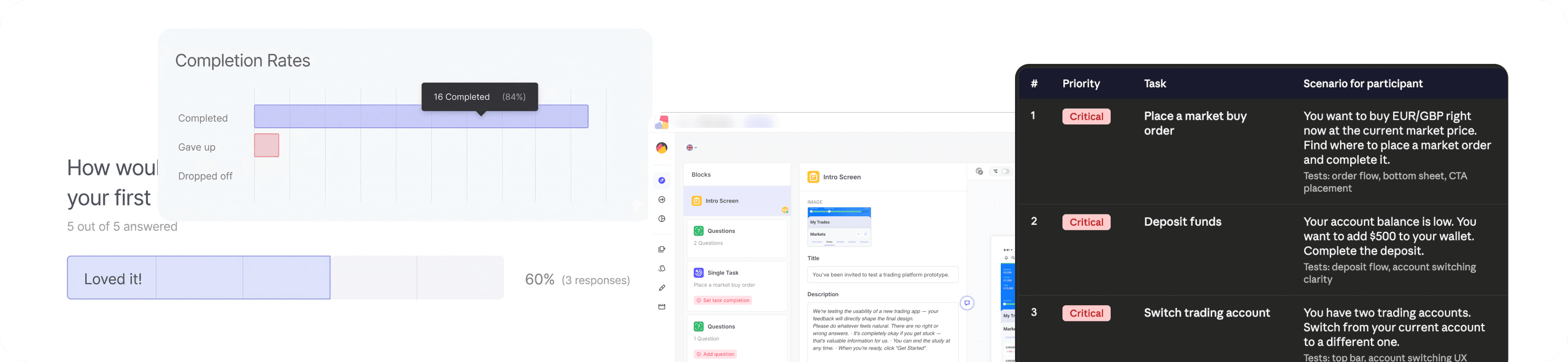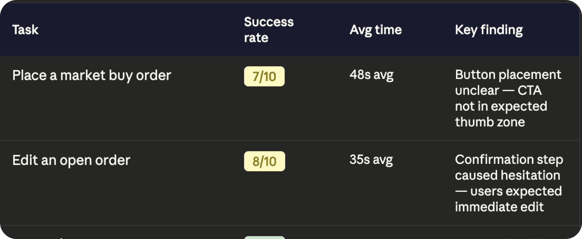 Task completion rate across 5 core flows — can users actually trade without confusion?