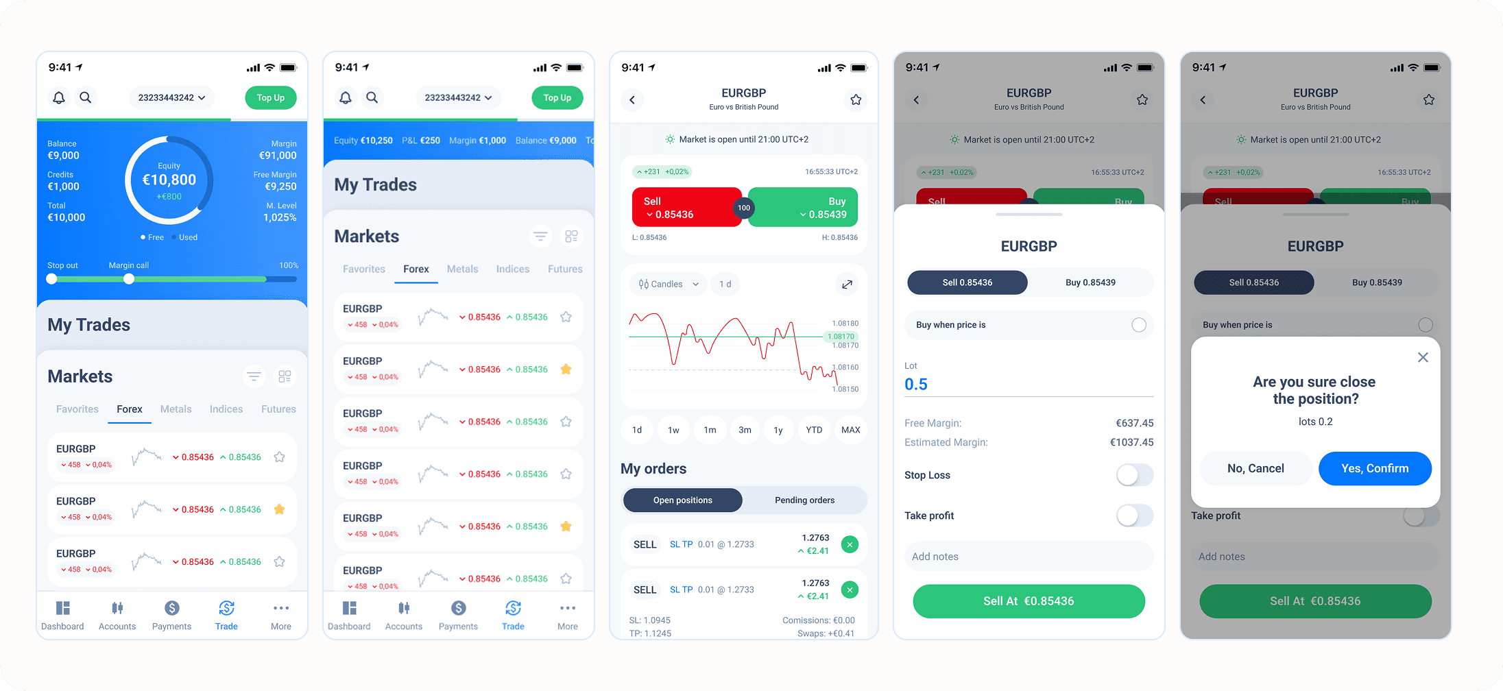 Action confirmation system — standard confirmation states after each user action, ensuring clarity at every step of the trading flow