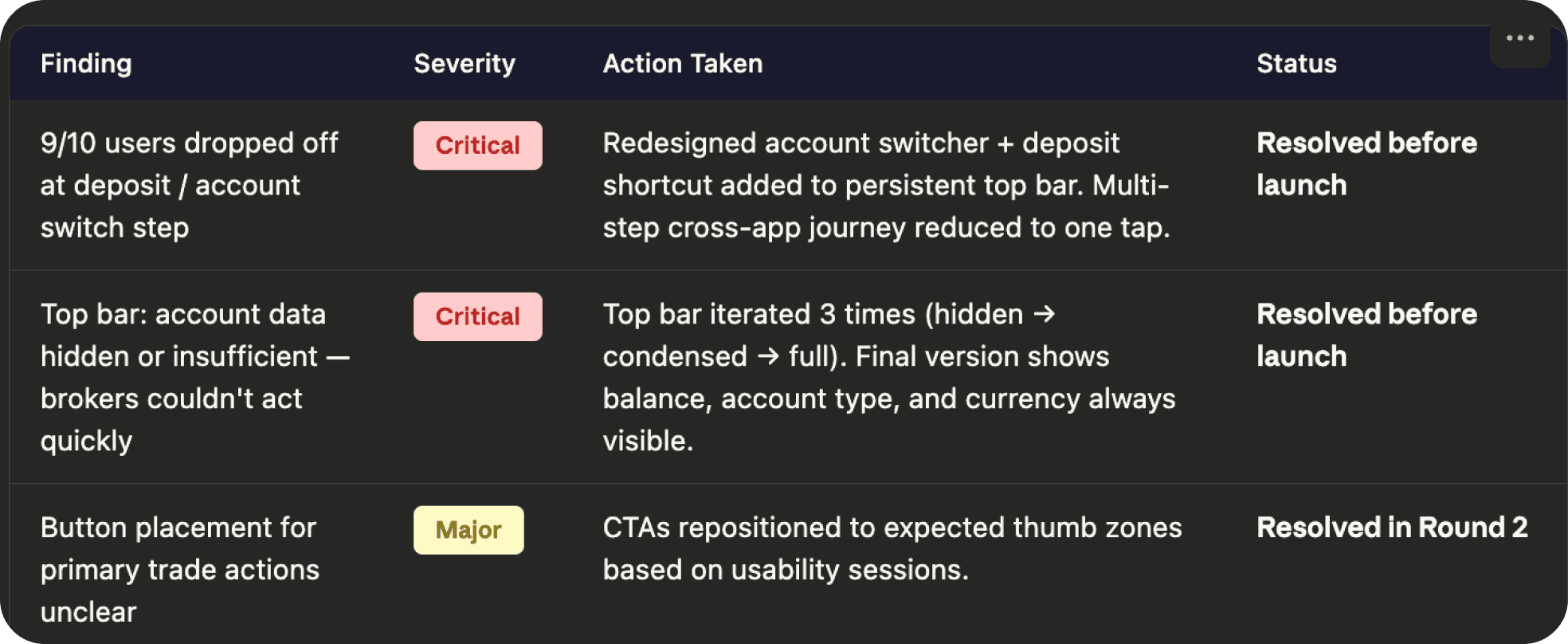 No internal expertise: No one inside the company had deep trading UX experience. I learned the domain from scratch while designing it.