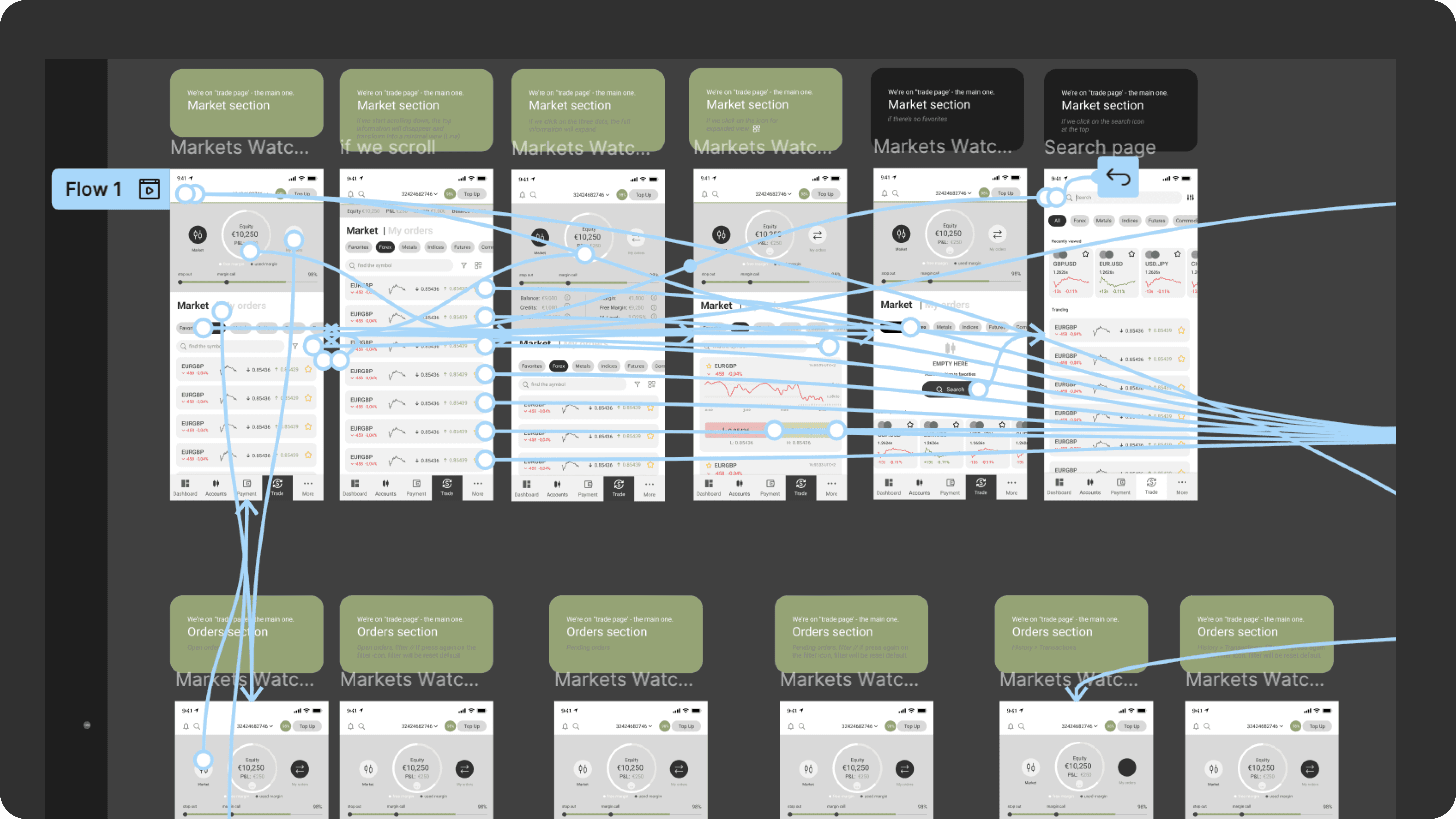 Mapped all key journeys before wireframing: order placement, account switching + deposit, transaction history.